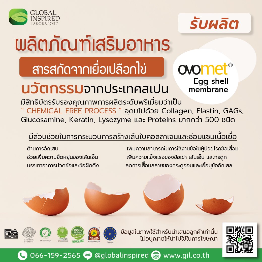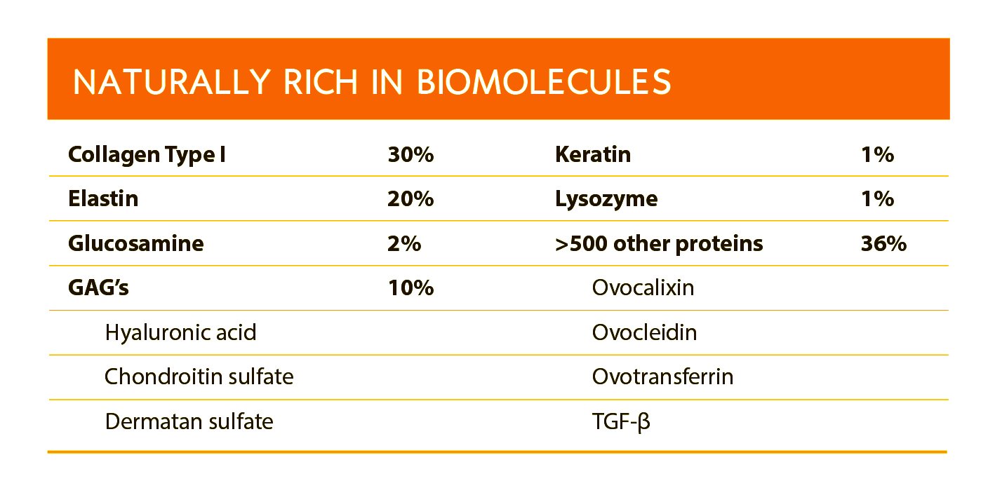 นั่นก็คือสารสกัดจากเยื่อเปลือกไข่ นวัตกรรมจากประเทศสเปน มีสิทธิบัตรรับรองคุณภาพการผลิตระดับพรีเมี่ยมว่าเป็น Chemical free process เป็นสารสกัดจากธรรมชาติ 100% จากเยื่อเปลือกไข่ ( Egg shell membrane ) อุดมไปด้วย Collagen, Elastin , GAGs , Glucosamine , Keratin , Lysozyme แล Proteins มากกว่า 500ชนิด ประกอบไปด้วย Transforming growthfactor ซึ่งมีส่วนช่วยในการกระบวนการสร้างเส้นใบ คอลลาเจนและซ่อมแซมเนื้อเยื้อ