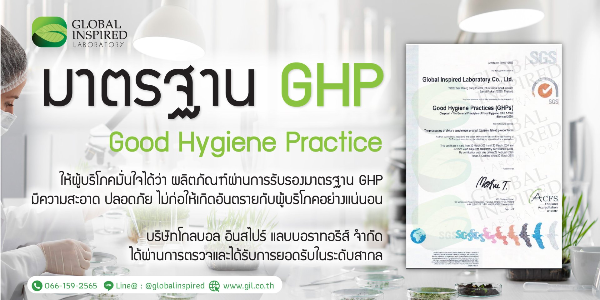 GIL บริษัท โกลบอล อินสไปร์ แลบบอราทอรีส์ เราเป็นโรงงานที่ได้รับการรับรองมาตรฐาน GMP มาแล้ว และยังได้ผ่านการตรวจสอบมาตรฐานอย่างเข้มข้น ปฎิบัติตามหลักมาตรฐานสากลอย่างสม่ำเสมอ ทำให้สามารถผ่านการรับรองมาตรฐาน GHP เป็นที่เรียบร้อย